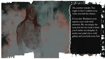 My god this was such an artistic piece! I love how Modesto/a don't look that much different in-between gender, they are such gender envy. Not only that but the characters that have sprites all look so cool and wonderful, MC themselves are pretty mysterious but I can guess they were a fallen noble and running away from debt collectors (assuming) that's why they don't have proper credentials and keeps their head low. Not only that but I adore the artistic aspect of not only the art but the way the story was being described, it felt like it had the style of old writing (thinking of like Dracula and whatnot, but more modern and shorter). Adore the mystery of it all, and the text for Ending 4 was quite intense in a good way!